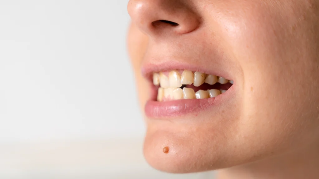 Dentes perdidos com implantes dentários, que são raízes artificiais de titânio inseridas cirurgicamente no osso da mandíbula ou maxila para dar suporte a coroas, pontes ou próteses fixas.